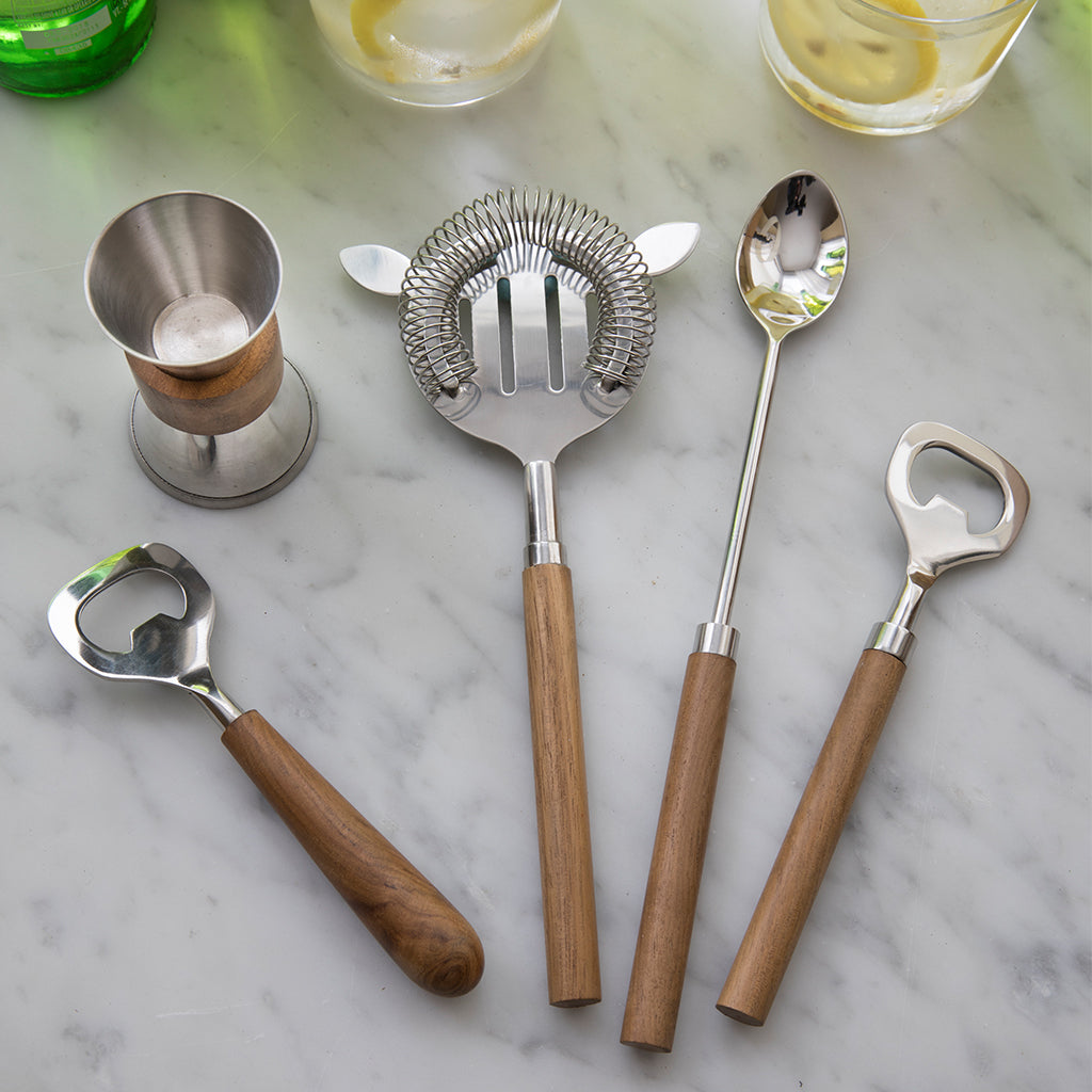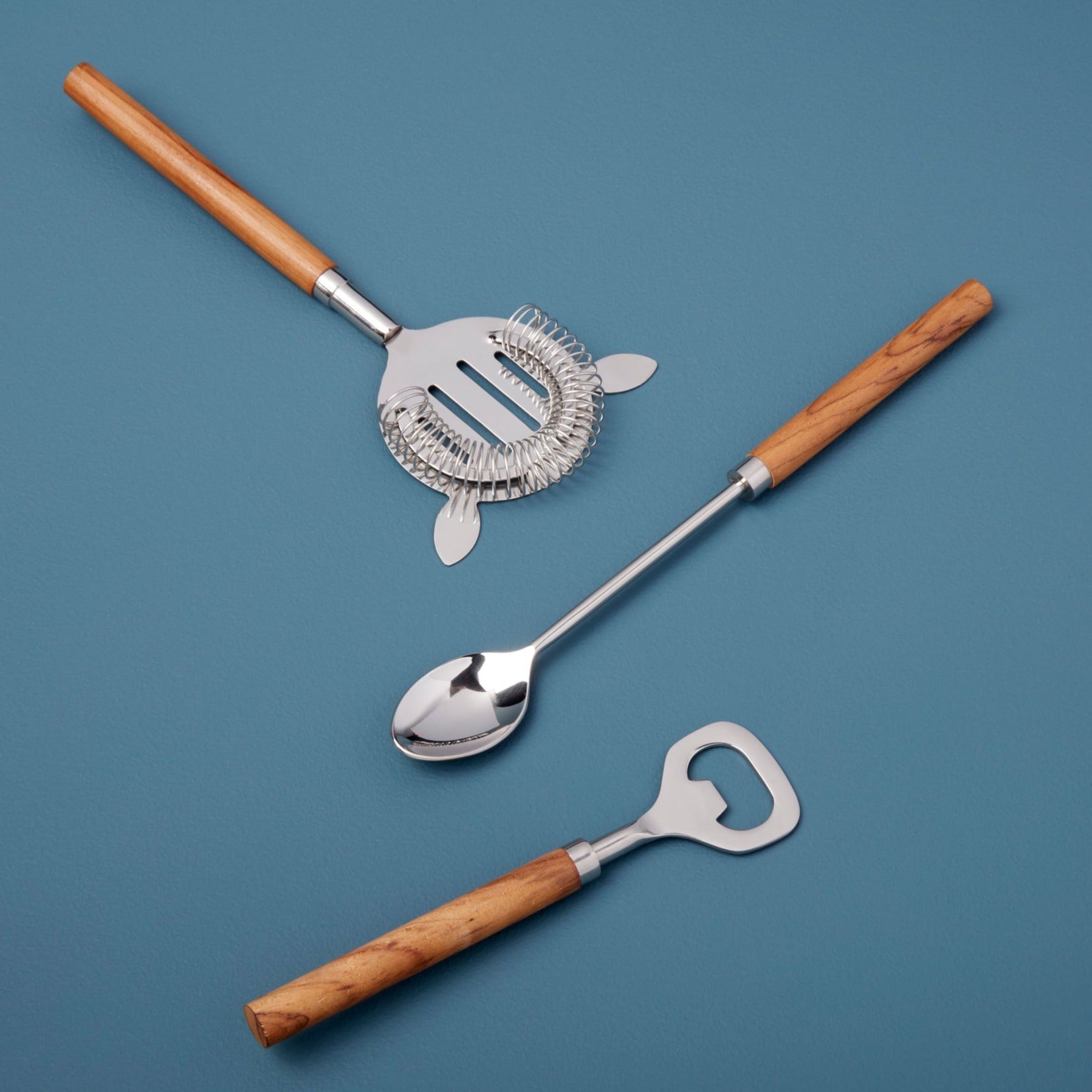 Keep calm and enjoy happy hour with these must-have bar tools. Sleek and sturdy in design, our Almora Bar Set includes a strainer, bottle opener, and a mixing spoon. Masterfully mix even the most precise of cocktails with curved teak handles for extra support, sustainably harvested and crafted by hand in Thailand.